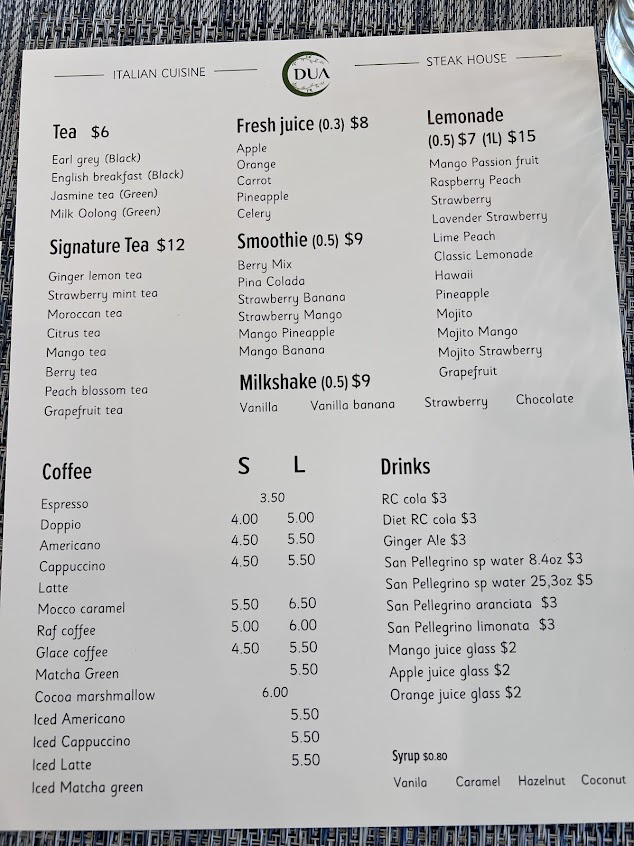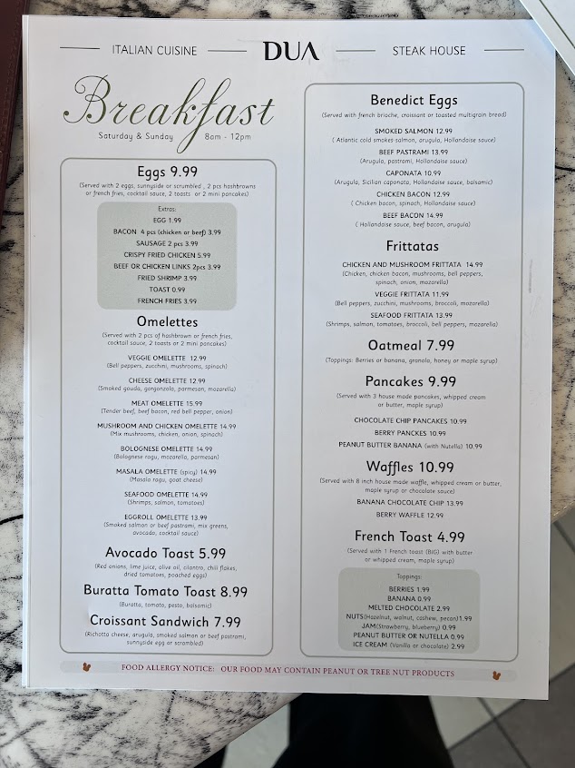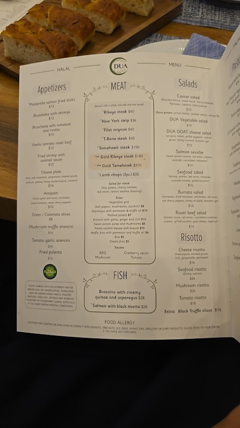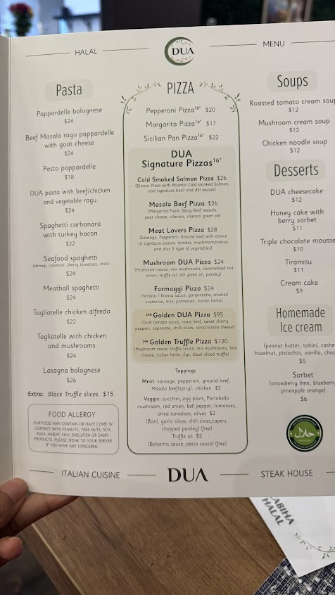 Welcome to DUA Italian Cuisine and Steak House, where we serve authentic Italian dishes and premium halal steaks. Our menu offers a variety of delectable options including freshly prepared pastas, wood-fired pizzas, and juicy steaks. Whether you're here for a family meal or a romantic dinner, our warm ambiance and exceptional service ensure a memorable dining experience. Join us today and indulge in the finest Italian and steakhouse cuisine, all prepared with the freshest ingredients.